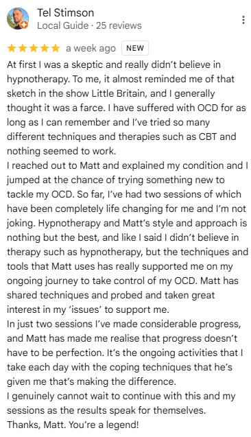 “I enjoyed working with Matt through a series of… …hypnotherapy sessions. Matt made me feel comfortable from the start, he was clear about timelines, what was required from me and what to expect. He also responded to how I work best by giving me clear ‘homework’ and targets between sessions.