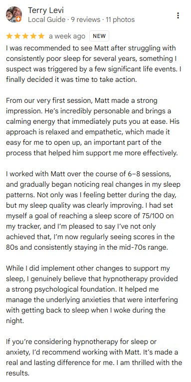 “I’ve had such an amazing experience working with Matt over the past 5 months. I saw a very significant improvement in how I deal with personal struggles from the very first Hypnotherapy [session].